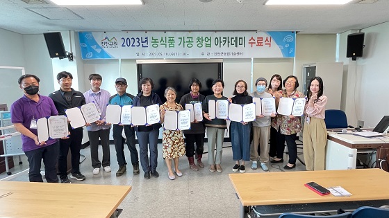 (전북=NSP통신) 김광석 기자 = 전북 진안군은 민선8기 공약인 중소농업인 가공창업 활성화와 경쟁력 있는 조직체 육성을 위해 추진한 2023년 농식품 가공창업 아카데미(2기)가 교육 수료생 15명을 대상으로 수료식을 가졌다고 12일 밝혔다.