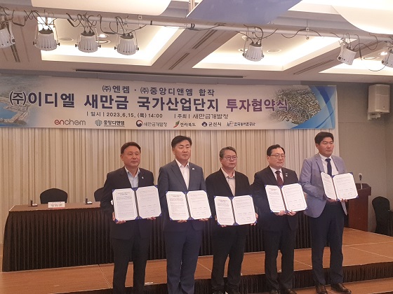 (전북=NSP통신) 김광석 기자 = 전북 군산시는 15일 새만금개발청, 전라북도, 한국농어촌공사 등 관계기관과 함께 국내 1위 이차전지 전해액 제조기업인 엔켐과 중앙디앤엠이 공동 설립한 이디엘과 이차전지의 핵심소재 중 하나인 리튬염 생산공장 건립을 위한 투자협약을 체결했다고 밝혔다.