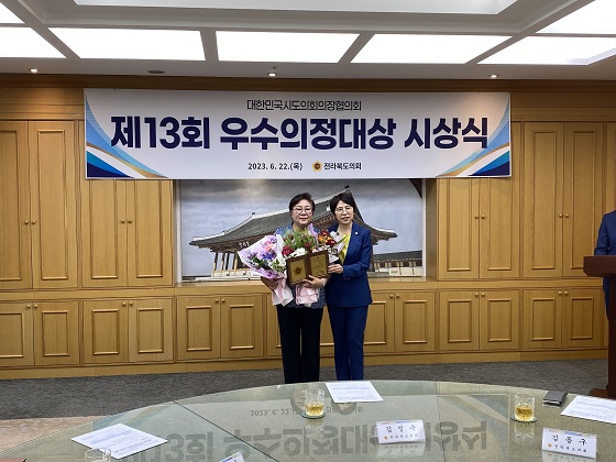 NSP통신-22일 박정희 전북도의원(왼쪽·군산3)이 제13회 우수의정대상 시상식에서 지역경제 활성화 및 주민 복리 증진 위한 조례 발굴 등의 공로를 인정받아 의정대상을 수상했다. (사진 = 전북도의회)