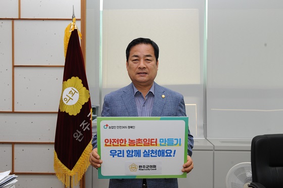 서남용 의장은 ‘농업인 안전 365!’, ‘사고없는 안전한 농촌!’을 구호로 ‘안전한 농촌일터, 우리 함께 실천해요’라는 문구가 적힌 피켓을 들고 사진을 촬영해 완주군의회 SNS에 게시물을 올렸다.