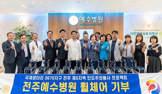 이날 봉동로타리클럽을 포함한 국제로타리 3670지구 6개 클럽은 인도주의봉사 프로젝트를 시작으로 전주예수병원 측에 휠체어 10대를 기증했다.