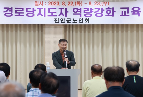 NSP통신-전춘성 진안군수가 진안군어르신일자리지원센터에서 진행된 경로당지도자 역량강화교육에서 인사말을 하고 있다. (사진 = 진안군)