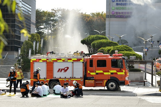 훈련은 갑작스런 지진으로 장수 한누리전당이 붕괴되면서 대형 화재가 발생했다는 가정하에 재난 상황 발생에 따른 상황판단 회의와 상황전파, 현장 통합지원본부와 응급의료소 설치 등의 훈련을 진행했다.