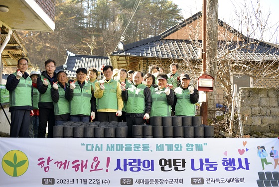 새마을운동 장수군지회 주최로 이뤄진 이번 연탄나눔 행사에는 최훈식 장수군수를 비롯한 이상수 새마을지회장, 새마을회원 등 40여 명이 함께 참여해 관내 소외계층 4세대에 연탄 1700여 장을 전달하며 따뜻한 온기를 나눴다.
