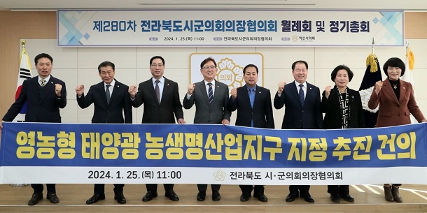 (전북=NSP통신) 김광석 기자 = 전북 완주군의회 서남용 의장이 25일 익산시에서 열린 전라북도시군의회 의장협의회 월례회에서 글로벌생명경제도시 전북특별자치도를 실현하기 위한 ‘영농형 태양광 농생명산업지구’지정을 촉구했다.