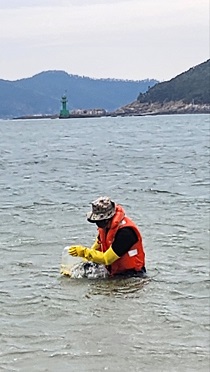 일본 후쿠시마 원전 오염수 해상 방류에 따른 국민 불안감 해소를 위해 선유도해수욕장 방사능 조사를 위한 샘플을 채취하고 있다. (사진 = 군산시)