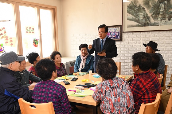 NSP통신-유희태 완주군수가 새롭게 책상을 설치한 비봉 경로당반을 방문해 인사말을 하고 있다. (사진 = 완주군)