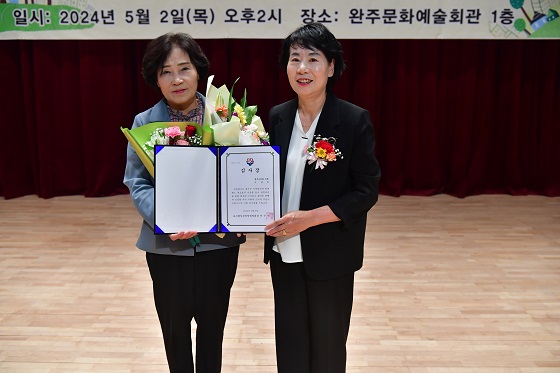 NSP통신-이순덕 완주군의회 의원(사진 왼쪽)이 2일 완주군 문화예술회관에서 열린 완주군 효도대상 시상식 및 어르신 위안행사에서 효사랑실천 전북협의회로부터 감사패를 수상하고 있다. (사진 = 완주군의회)