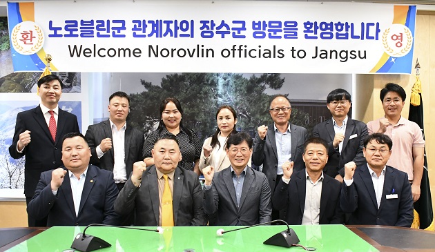 NSP통신-몽골 노르블링군 방문단이 28일 장수군을 찾아 최훈식 군수(앞줄 가운데)와 간담회을 갖고, 기념촬영을 하고 있다. (사진 = 장수군)