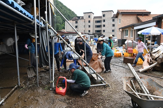주말 내 직원들과 자원봉사자, 유관기관 등 일 300여 명이 9일부터 10일 사이 발생한 집중호우 수해복구 현장에서 구슬땀을 흘렸다.
