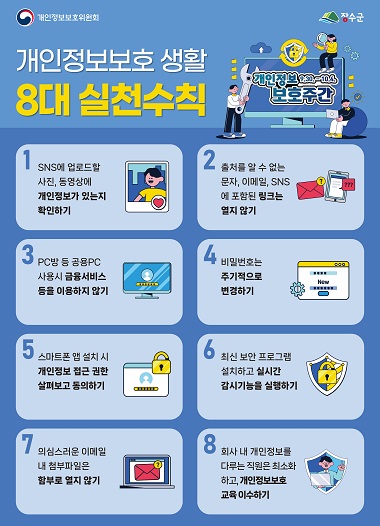 군은 개인정보 보호문화가 확산될 수 있도록 군 대표홈페이지, SNS, 포스터 등에 ‘개인정보보호 생활 8대 실천수칙’을 제작해 배포하고 있다.