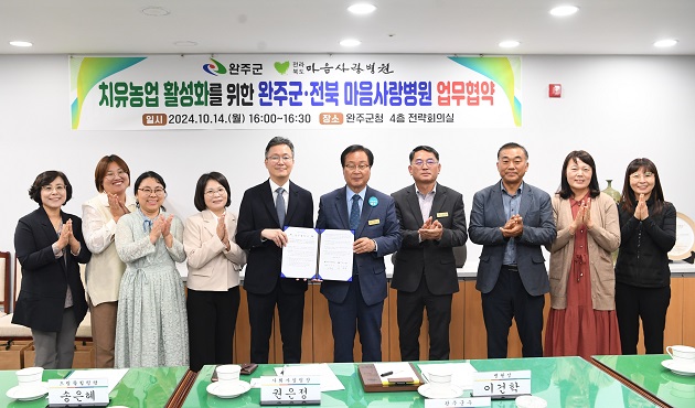15일 완주군에 따르면 지난 14일 완주군청에서 유희태 완주군수, 이건학 전북 마음사랑병원장은 관내 치유농장주 등 11명이 참석한 가운데 업무협약을 체결했다.