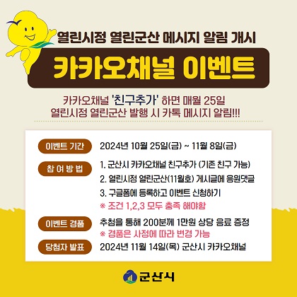 (전북=NSP통신) 김광석 기자 = 전북자치도 군산시가 카카오 채널 활성화를 위해 오는 25일부터 다음 달 8일까지 2주간 ‘카카오 채널’ 행사를 진행한다.