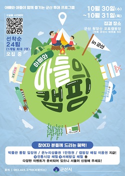 캠핑 여행은 오는 30~31일 이틀 동안 군산 청암산오토캠핑장에 아빠와 아들 70여 명이 한자리에 모여 1박 2일 캠핑을 즐기면서 군산의 명소 곳곳을 둘러보며 진행된다. 주요 코스는 ▲시간여행마을 ▲전통시장 ▲청암산 등산 프로그램으로 진행된다.
