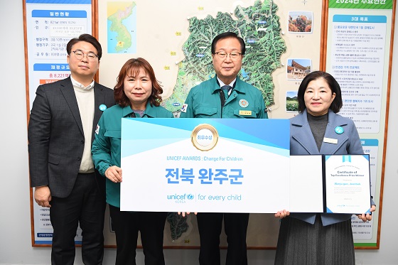 16일 완주군에 따르면 최근 서울 마포구 유니세프한국위원회에서 열린 시상식에서 완주군은 군 단위로는 유일하게 아동친화도시 비전을 지속적으로 실현한 공로를 인정받아 최우수상을 수상했다.
