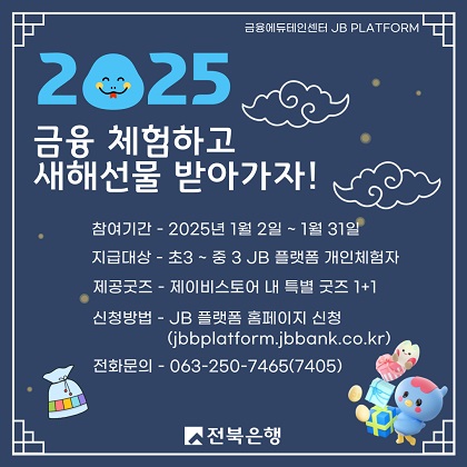 (전북=NSP통신) 김광석 기자 = JB금융그룹 전북은행(은행장 백종일)이 운영하는 금융에듀테인센터 JB플랫폼에서는 개인 체험자를 대상으로 1월 한 달간 특별 굿즈 제공 이벤트를 진행한다.