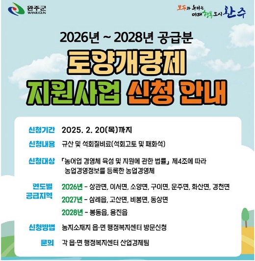 신청한 토양개량제는 선정심사를 거쳐 ▲2026년 상관면, 이서면, 소양면, 구이면, 운주면, 화산면, 경천면 ▲2027년 삼례읍, 고산면, 비봉면, 동상면 ▲2028년 봉동읍, 용진읍에 순차적으로 공급된다.