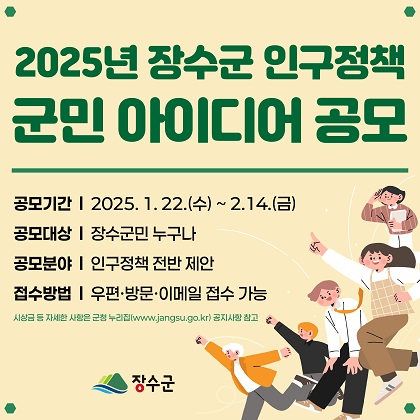 (전북=NSP통신) 김광석 기자 = 전북자치도 장수군이 다음 달 14일까지 ‘2025년 인구정책 군민 아이디어 공모’에 나선다.