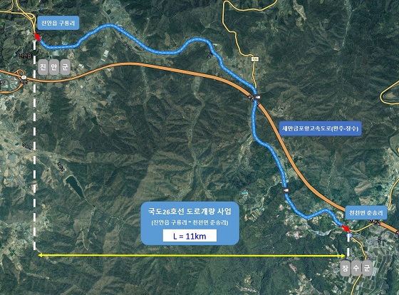 (전북=NSP통신) 김광석 기자 = 전북자치도 장수군 천천면과 진안군 진안읍을 연결하는 2차선인 국도26호선 구간이 정부의 예비타당성조사 대상지로 선정되며 주민 숙원사업 추진에 청신호가 켜졌다.