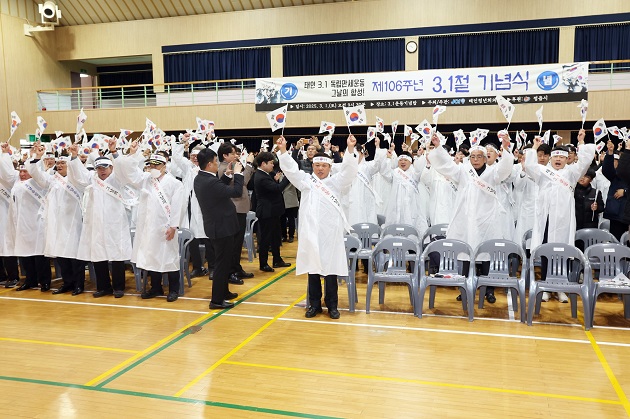 기념식은 3·1운동 기념탑에서의 헌화·참배로 시작돼 태인초등학교로 이동해 이어졌다. 안광식 광복회 정읍지회장이 기미독립선언서를 낭독했고 이어 3·1절 노래 제창, 기념사, 만세삼창이 진행됐다.