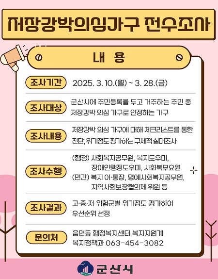 (전북=NSP통신) 김광석 기자 = 전북자치도 군산시가 저장강박 의심·위기가구의 정확한 실태 파악을 위해 10일부터 전수조사를 실시한다.