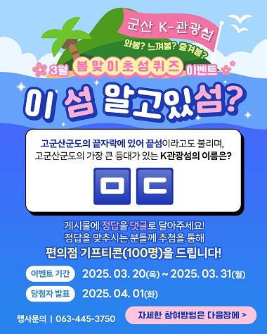 먼저 오는 20~31일 k-관광섬(말도,명도,방축도) 초성 맞추기 퀴즈 이벤트가 열리는데, 군산 k-관광섬 인스타그램 팔로워라면 누구나 참여할 수 있다. 종료 후에는 참여자 중 추첨을 통해 소정의 모바일 상품권을 지급한다.