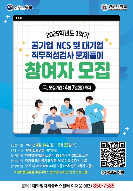 (전북=NSP통신) 김광석 기자 = 원광대학교(총장 박성태) 대학일자리플러스센터는 오는 14일부터 다음 달 23일까지 재학생과 졸업생, 지역 청년을 대상으로 공기업 NCS 및 대기업 직무적성검사 문제풀이 프로그램을 온라인으로 진행한다고 밝혔다.