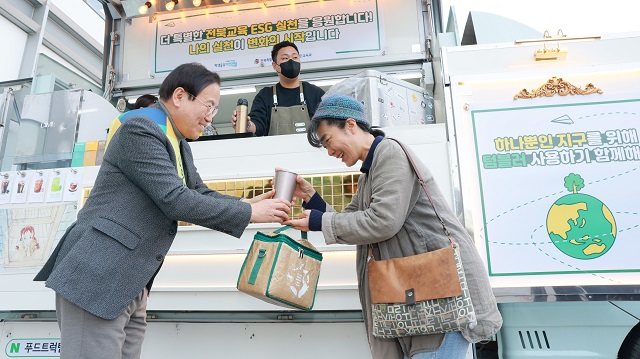 (전북=NSP통신) 김광석 기자 = 전북자치도교육청(교육감 서거석)이 1회용품 사용을 줄이고 텀블러 사용을 장려하기 위해 1일 ‘찾아가는 ESG(환경·사회·윤리경영) 커피차’를 운영했다.