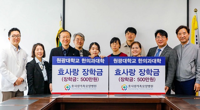원광대에 따르면 ‘효사랑 장학금’은 효사랑가족요양병원 김정연, 박진상 병원장의 장학금 기탁으로 재원을 마련해 한의과대학 졸업 후 대학원에 입학한 전일제 대학원생들을 지원하는 것으로, 지난 2023년 첫 기탁을 시작으로 매년 1000만원씩 10년 기탁을 약정했다.