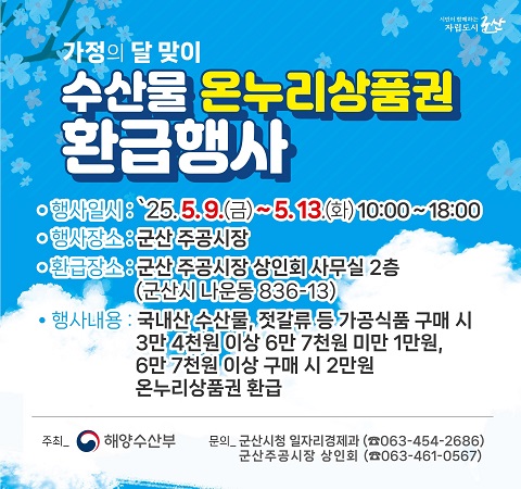 (전북=NSP통신) 김광석 기자 = 전북 군산시가 5월 가정의 달을 맞아 9일부터 13일까지 군산 주공시장에서 해양수산부 주관 ‘수산물 온누리상품권 환급행사’를 진행한다고 밝혔다.