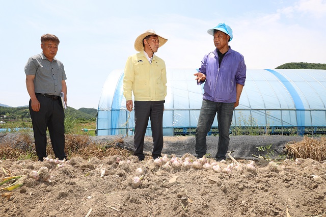 (전북=NSP통신) 김광석 기자 = 전춘성 전북 진안군수가 본격적인 마늘 수확철을 맞아 수확이 한창인 성수면 마늘 재배현장을 찾아 농가의 애로사항을 듣고, 실질적인 지원 방안을 모색했다.