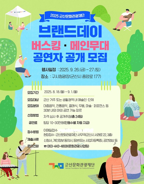 (전북=NSP통신) 김광석 기자 = (재)군산문화관광재단이 9월 26~27일 구 시청광장에서 열리는 ‘군산문화관광재단 브랜드 데이’에 참여할 벼룩시장(플리마켓)·체험부스 운영자와 거리공연(버스킹)·메인무대 공연자를 모집한다.