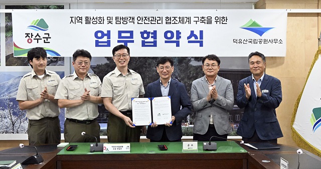 (전북=NSP통신) 김광석 기자 = 전북 장수군은 지난 20일 국립공원공단 덕유산국립공원과 ‘지역 산악 관광 활성화 및 탐방객 안전관리 협조체계 구축을 위한 업무협약(MOU)’을 체결했다고 밝혔다.