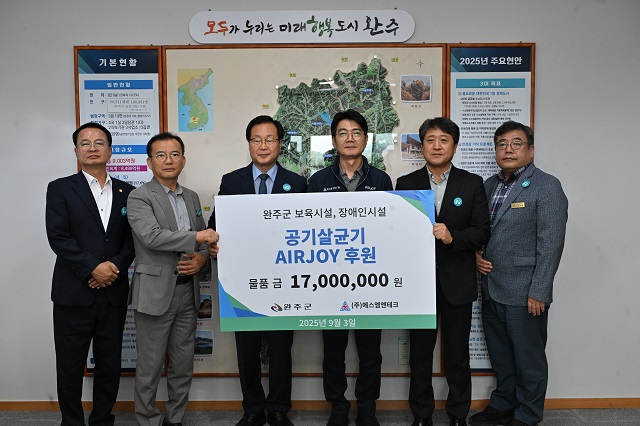 이날 전달식에는 김재천 부의장을 비롯해 유희태 군수, ㈜에스엠엔테크 이중수 대표, 선덕보육원 성제환 시설장, 다애공동체 송기준 시설장 등이 함께했으며, ㈜에스엠엔테크는 완주군 관내 보육시설과 장애인시설에 공기정화살균기 ‘에어조이(Airjoy)’ 20대(1700만원 상당)를 후원했다.