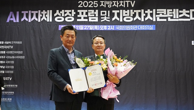 (전북=NSP통신) 김광석 기자 = 전북 완주군의회는 김재천 부의장이 27일 국회의원회관에서 열린 ‘2025 AI 지자체 성장 포럼 및 지방자치콘텐츠대상’ 시상식에서 농업·수산업·축산업 분야 대상을 수상했다고 밝혔다.