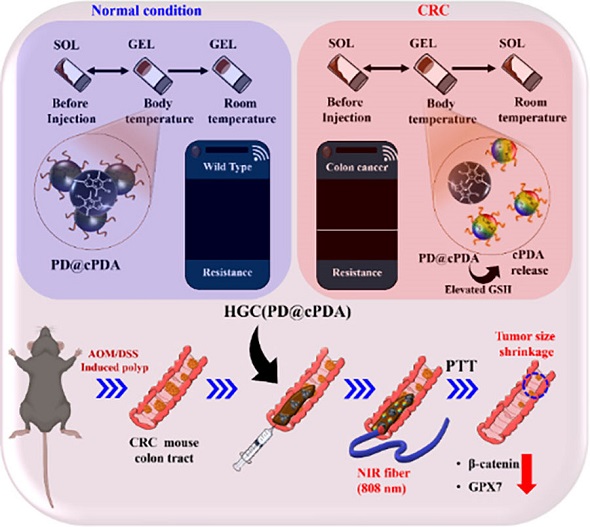 연구팀은 대장암 조직 내에서 글루타치온(GSH) 농도가 비정상적으로 높다는 점에 주목해 종양 미세환경(TME)에 반응할 때만 선택적으로 약물을 방출하고 겔화되는 ‘주사 주입형 전도성 하이드로겔’을 개발했다.