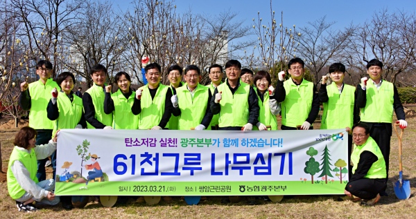 (광주=NSP통신) 김용재 기자 = 농협광주본부(본부장 고성신)는 “식목일을 앞두고 광산구 쌍암근린공원과 광산구 일대에서 탄소저감 실천과 산림보전을 위한 범농협 ‘6만1천 그루 나무심기 캠페인’ 을 실시했다”고 23일 밝혔다.