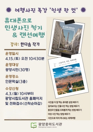 (전남=NSP통신) 김성철 기자 = 광양중마도서관은 오는 4월 15일 중마도서관 인문학실에서 2023 중마도서관 여행 사진 특강 ‘인생 한 컷’을 진행한다고 밝혔다.