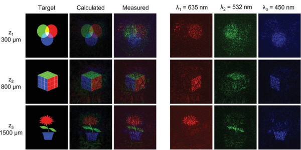 연구팀은 역설계 방법을 기반으로 단일 메타표면에서 입력할 수 있는 정보량을 다색 홀로그램에서는 최대 9개로, 단색 홀로그램에서는 최대 18개로 늘렸다. 그 결과, 각각의 면에서 빛의 삼원색 각 파장에 독립적인 홀로그램 이미지 인코딩으로 흑백이 아닌 다양한 색상의 이미지를 평면에 따라 깊이감 있게 구현했다.