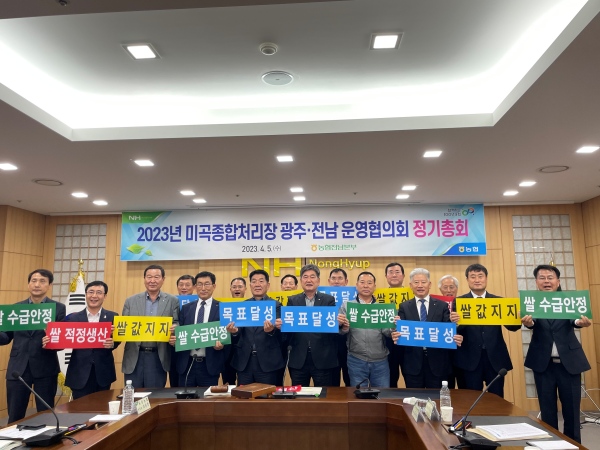 (전남=NSP통신) 김용재 기자 = 농협전남본부(본부장 박종탁)는 지난 5일 전남본부 중회의실에서 농협RPC광주·전남운영협의회(협의회장 김경채) 조합장 23명이 참석한 가운데 2023년도 정기총회와 쌀 수급안정 및 쌀 적정생산 대책 총력추진 다짐 결의대회를 개최했다고 6일 밝혔다.