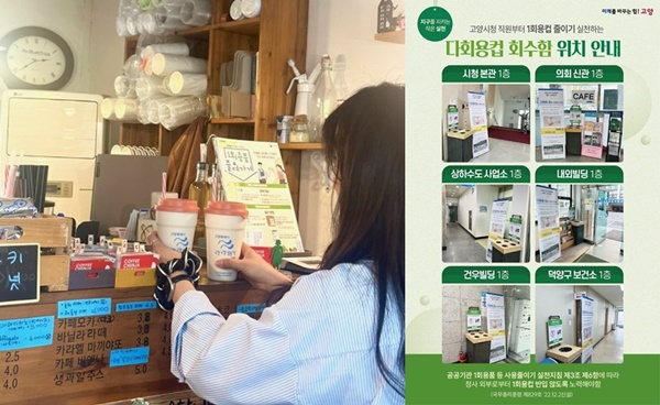 다회용컵 활성화 사업에 참여 중인 고양시청 주변 카페의 모습(좌)과 참여 카페(우)