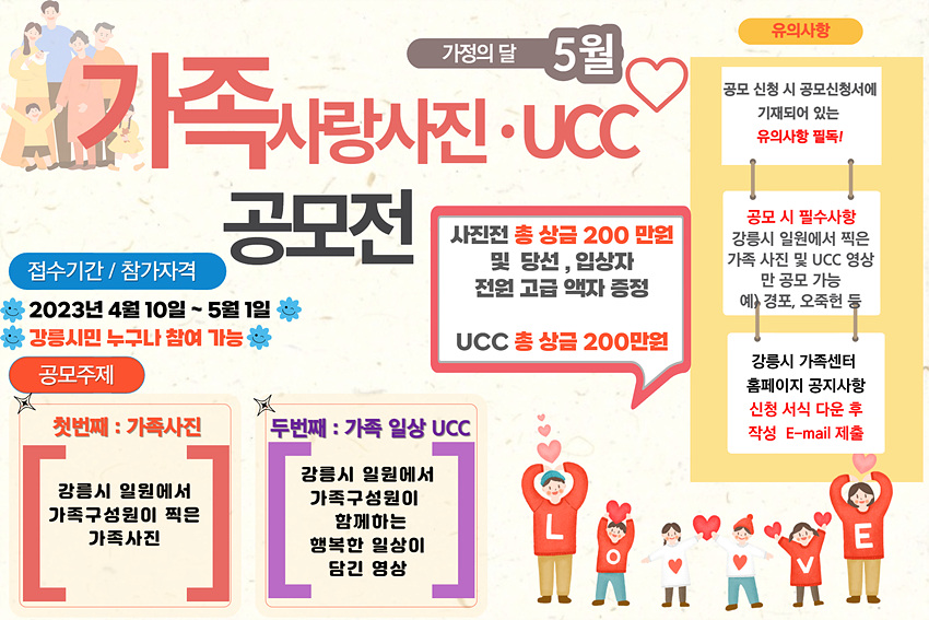 시 관계자는 “가족사진·손수 제작물(UCC) 공모로 강릉의 자연경관과 함께 가족의 사랑·소중함을 추억으로 만드는 계기가 되기를 바란다”고 말했다.