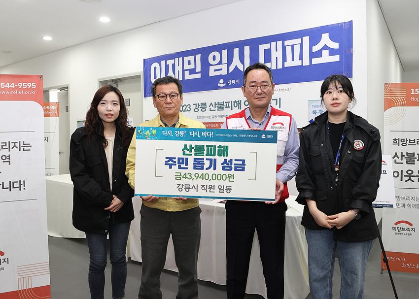 (강원=NSP통신) 조이호 기자 = 강원 강릉시(시장 김홍규)가 최근 발생한 도심형 산불로 큰 피해를 입은 주민들을 돕고 아픔을 함께 나누고자 직원 성금 모금 운동을 전개해 총 4394만원의 성금을 모금해 지난 22일 전국재해구호협회에 전달했다.