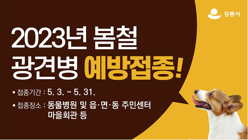 (강원=NSP통신) 조이호 기자 = 강원 강릉시(시장 김홍규)가 오는 3일부터 31일까지 지정동물병원 11개소 및 읍면동 순회접종 장소에서 ‘2023년 봄철 반려동물 광견병 예방접종’을 무료로 실시한다.