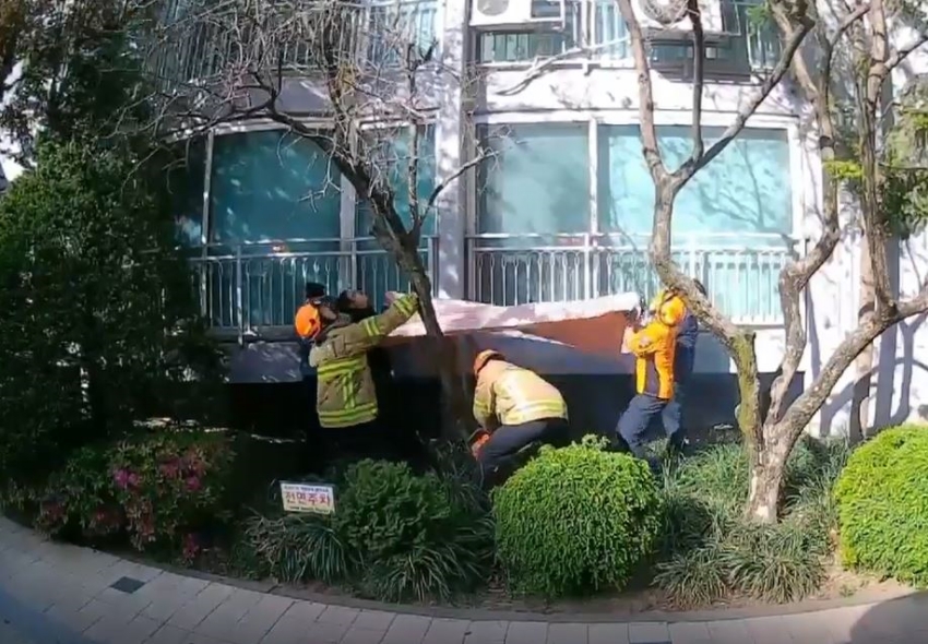 이에 소방서 구조대는 현장에 출동해 상황을 인계받고 에어매트 전개를 위해 조경수 및 관목을 제거하는 중에도 이불을 이용해 추락 사고를 대비하는 등의 사전 안전조치를 취했다.