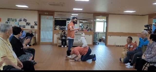 (경기=NSP통신) 김종식 기자 = 둥글개봉사단(단장 이웅종)이 지난 28일 충남 천안시에 위치한 천안실버타운을 방문해 어르신과 동물매개치유 견들이 함께하는 즐거운 시간을 보냈다.