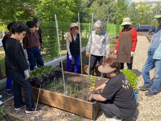 시민공동체 ‘행복한 시니어가드너’ 회원들을 대상으로 봄작물 모종심는 방법을 컨설팅하고 있다. (사진 = 수원시)