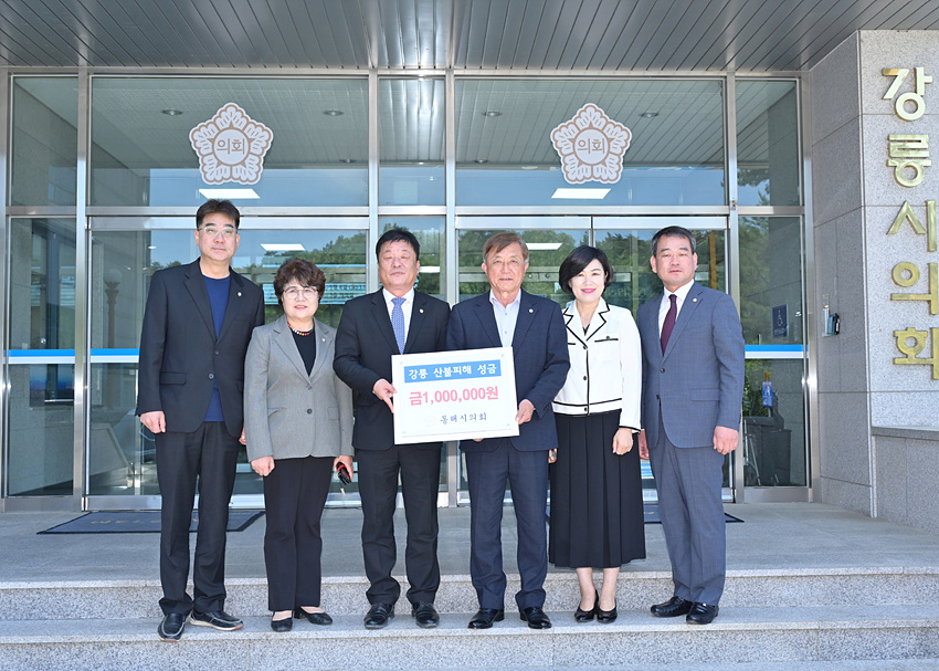 (강원=NSP통신) 조이호 기자 = 강원 동해시의회(의장 이동호)가 8일 강릉시의회(의장 김기영) 의장실에서 강릉 산불 피해 성금을 강릉시의회에 전달했다.