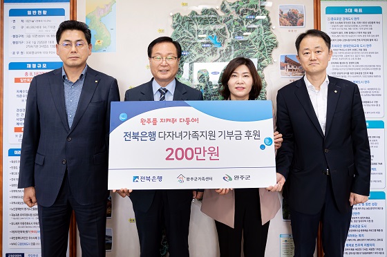 이번 후원금은 오는 20일 완주군이 주최하고 완주군 가족센터가 주관하는 ‘행복한 다둥이 가정’ 행사 응원 및 다자녀 가정을 격려하고 경제적 지원을 위해 마련했다.
