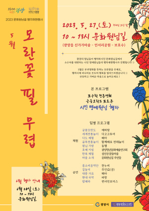 이번 회차는 ‘모란꽃 필 무렵’이라는 부제로 진행되며, 오는 5월 27일 토요일 오전 10시부터 오후 1시까지 광양읍 인서리 154번지(보호수 앞 주차장) 일원에서 개최된다.